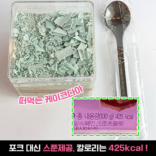 떠먹는 케이크라 포크 대신 작은 사이즈의 스푼이 제공되네요. 손잡이 길이가 길어서 먹기 편할 것 같아요. 총중량 100g에 칼로는 425kcal ㄷ ㄷ 장난 아니네요...