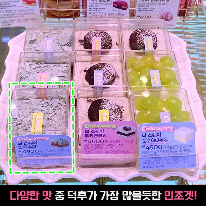 밥심이 매장을 방문했을 때 다양한 맛의 스퀘어 케이크가 있었어요. 옆에 있는 쿠앤크도 끌렸지만 민초단의 궁금증 해소를 위해 민트 초코를 겟 했습니다!