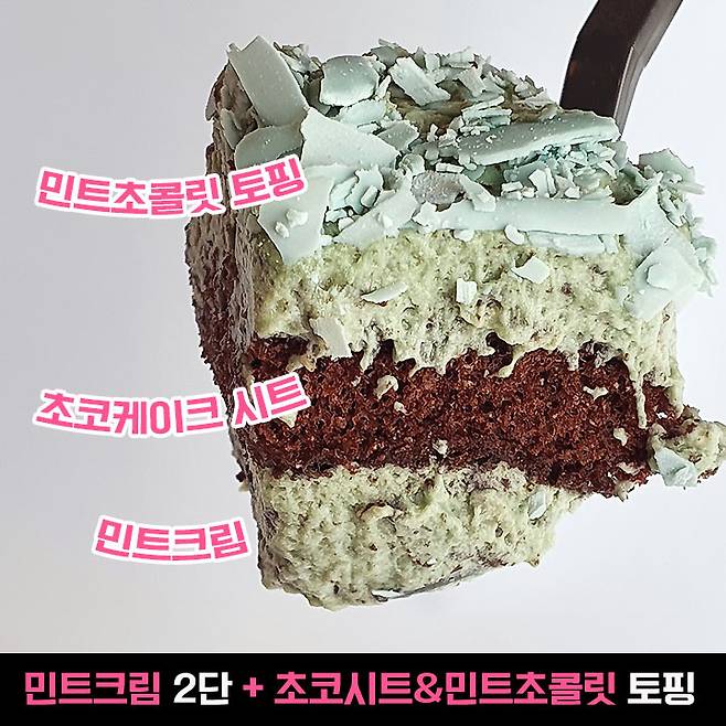단면만 보았을 땐 민트 크림만 있는 줄 알았는데 초코시트 위에 초코크림 도 발라져 있었어요! 두 가지 크림 모두 초콜릿 알갱이가 알알이 박혀있어서 입에 넣었을 때 알갱이가 사르르 녹는 게 느껴져요. 과하게 달지 않아 좋았지만 민트 크림의 핵심인 민트 맛은 좀 약한듯했습니다.