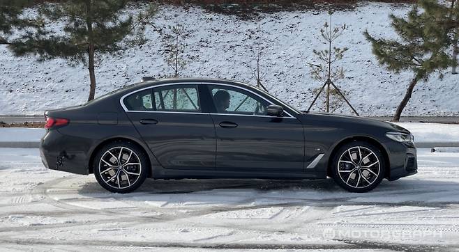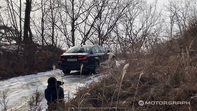 겨울용 타이어가 장착된 5시리즈는 안정적인 출발이 가능했다. 가속 페달에 발을 살짝만 얹어도 마구 움직이던 스팅어와 달리 바닥을 단단하게 움켜쥐고 앞으로 나아간다. 훨씬 빠른 속도로 달려도 차체는 안정적인 자세를 유지했다. 뒤쪽이 미끄러지거나 방향이 이리저리 바뀌지도 않았다.