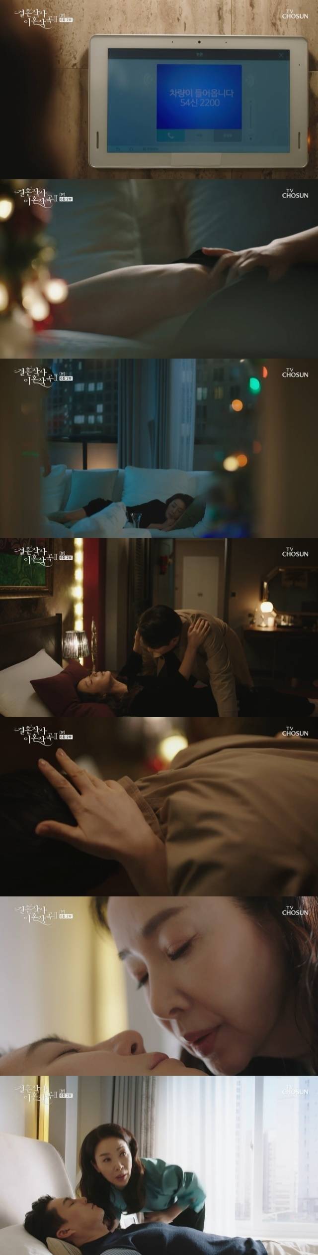 그래도 김동미는 유혹을 포기하지 않았다. 사피영이 딸과 집을 비우고 신유신과 단둘이 남은 사이, 마사지를 해준다는 핑계로 침실에 입성했다. 그러면서 김동미는 신유신이 잠이들자 그에게 입술을 가져다대 이목을 집중시켰다. 그러나 김동미의 입맞춤은 사피영이 예상보다 일찍 집에 들어오며 불발됐다. 김동미의 흑심이 언제쯤 신유신, 사피영에게 발각될지 귀추가 주목된다. (사진=TV조선 '결혼작사 이혼작곡2' 캡처)
