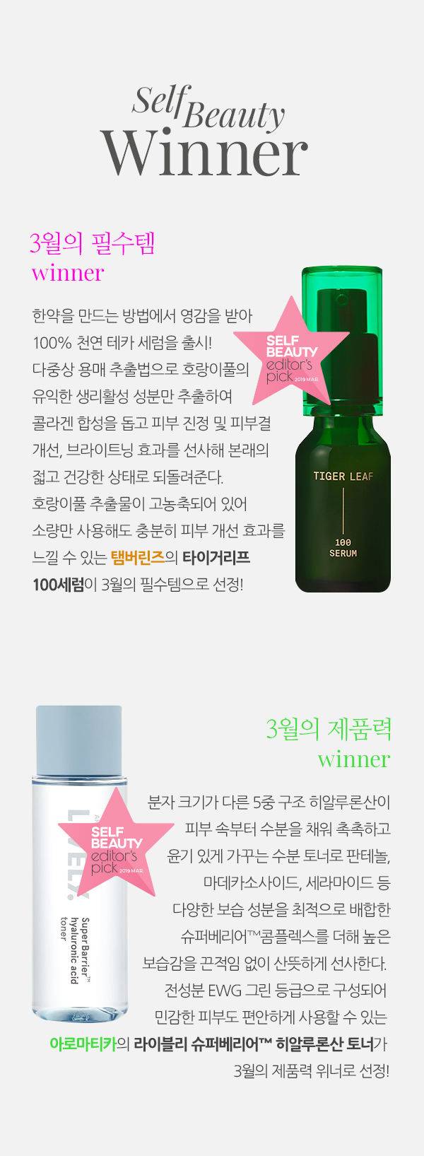 5. 천연 호랑이풀만 담은 100% 단일 성분 초록 세럼으로 다중상 용매추출법을 이용해 유익한 생리 활성 성분들을 조화롭게 추출하여 피부 속 콜라겐 합성을 돕는 탬버린즈의 타이거리프 100세럼 15ml 31,000원.
