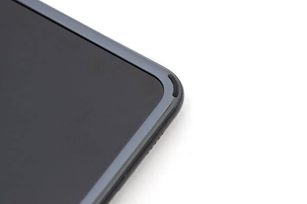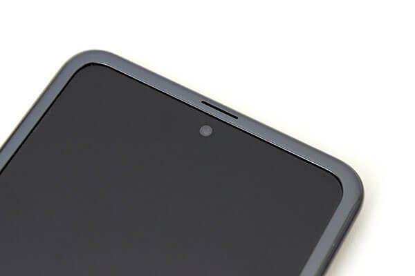 디스플레이의 위쪽에는 전면 카메라가 중앙에 위치해 있고, 그 위에는 아주 얇아서 마치 좁은 틈처럼 보이는 음성통화용 리시버가 자리잡고 있다. 전면 카메라는 베젤이 아닌 디스플레이 위에 있는 펀치 홀 타입으로, 거의 완전한 베젤리스를 구현하고 있다.