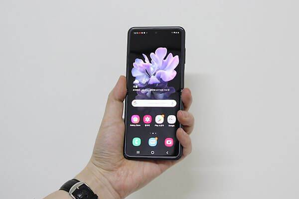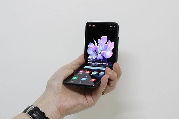 갤럭시Z플립을 펼친 상태에서 쥐고 있으면 일반 스마트폰 가운데 대화면 모델을 들고 있는 것과 다르지 않다. 갤럭시 폴드가 한 손으로 들고 사용하기에 약간의 불안감이 느껴지던 것과는 달리, 한 손으로 편안하게 들고 사용할 수 있다.