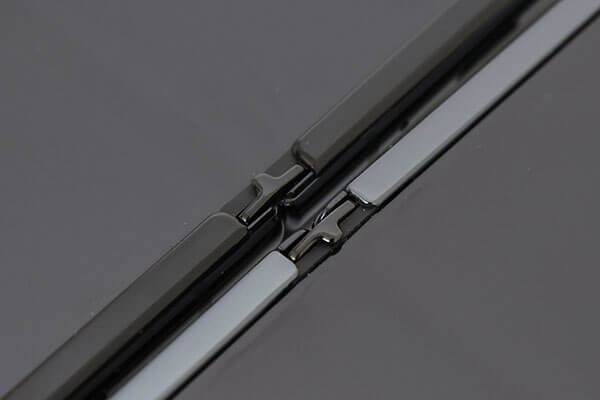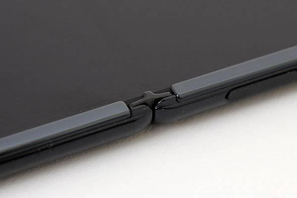펼쳤을 때 보이는 힌지의 양끝 부분도 갤럭시 폴드와 거의 동일한 구조이다. 이렇게 특별한 부품으로 끝을 막아서 먼지나 이물질이 힌지 안쪽으로 유입되는 것을 막아준다.