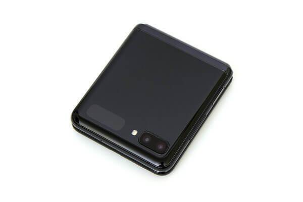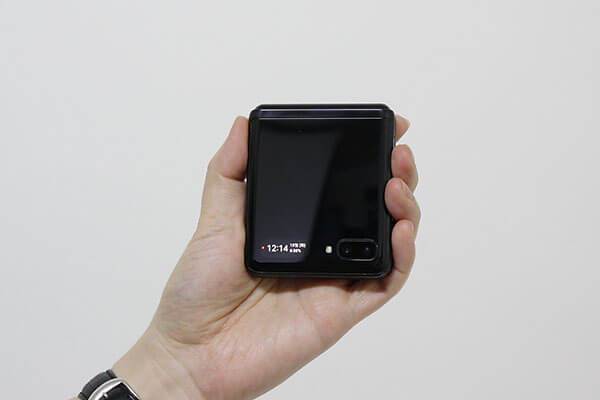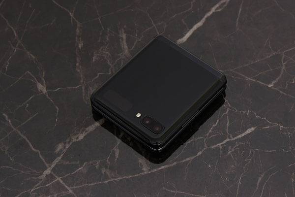 접혀있는 상태의 삼성 갤럭시Z플립은 자그마한 크기다. 물론 예전 피처폰 시절의 폴더폰 정도의 크기를 기대했다면 다소 크게 느껴질 수도 있겠지만, 대형화 추세인 스마트폰 시대에 이 정도면 꽤나 작아졌다고 할 수 있겠다. 접혀진 윗면에는 듀얼 카메라와 LED 플래시가 보이고, 그 옆으로 자그마한 커버 디스플레이가 있다. 반대편에는 아무것도 없다.