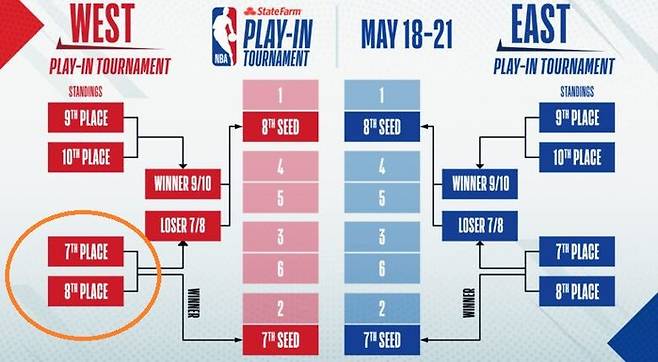 이같은 시스템 속에서, 제임스의 레이커스와 커리의 골든 스테이트는 7위 결정전에서 맞붙을 것이 유력해졌다. 레이커스는 사실상 서부 7위가 확정된 상황이다. 시즌 5경기를 남겨두고 있는 현재, 6위 포틀랜드 트레일블레이저스와는 1.5경기차, 8위 골든 스테이트와는 2.5경기 차이가 난다.