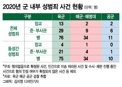 머니투데이 더300이 국방부에 정보공개를 청구한 결과 작년 군 내 성범죄 사건(가해자와 피해자가 모두 군인)의 가해자 규모는 182명인 것으로 확인됐다. 국방부에 따르면 우리나라 현역 군인 규모는 약 55만5000명(장교 6만4000명, 준·부사관 13만5000명 병사 35만6000명) 규모다. 이를 가해자 수에 대입하면 작년 우리 군의 성범죄 발생률은 '최소 0.03%'란 계산이 나온다.