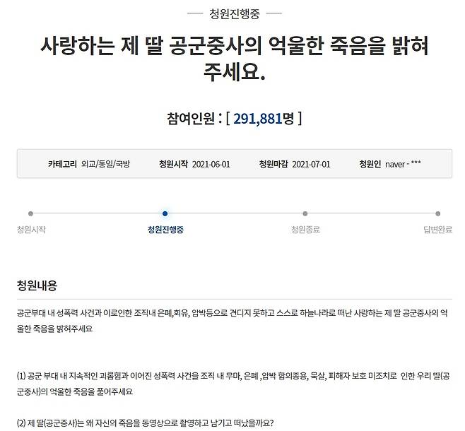 전날엔 청와대 국민청원 게시판에 "사랑하는 제 딸 공군중사의 억울한 죽음을 밝혀주세요"라는 청원이 올라와 이날 현재까지 29만1881명이 동의했다. 청원 동의 요건인 20만명을 훌쩍 넘겼다.
