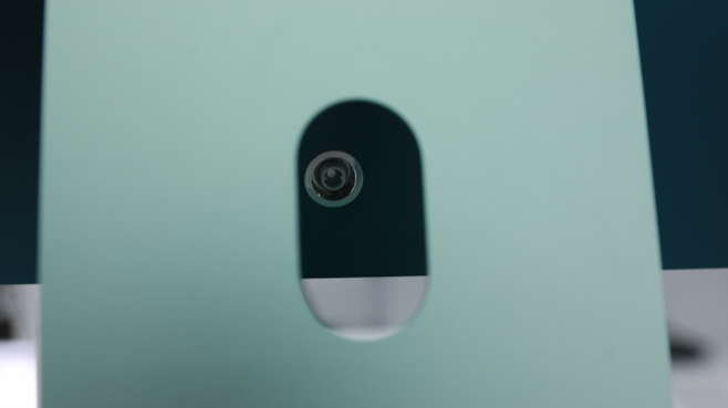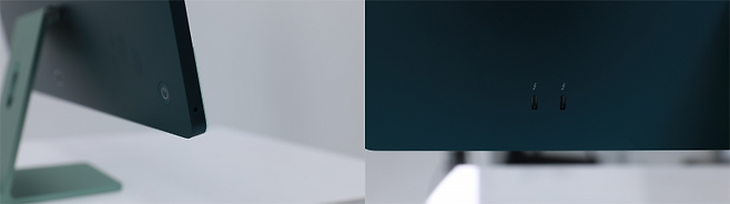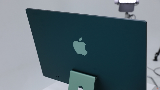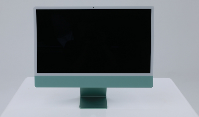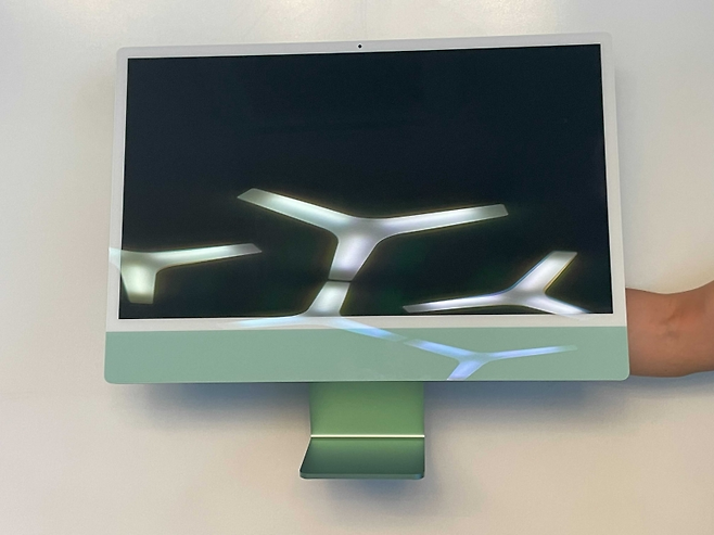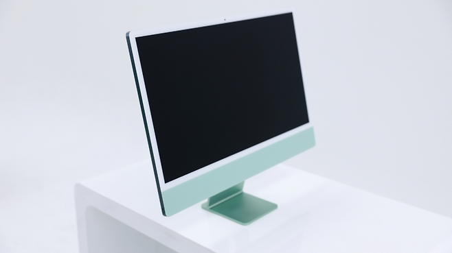 아이맥은 블루·그린·핑크·실버·옐로·퍼플·오렌지 등 총 일곱 색상으로 구성됐다. 기자는 7코어 CPU의 그린 색상 제품을 수령했다. 인터넷 커뮤니티에선 상대적으로 인기가 떨어지는 색으로 언급되긴 하나, 첫인상은 매우 만족스럽다. 전면부는 ‘민트’에 가까운 파스텔톤이 확 눈에 들어오고, 후면부는 청록색으로도 부를 수 있을 정도로 색이 진하다. 두 색의 조합만으로 마음이 편안해지는 느낌이 든다.