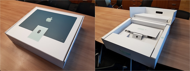 제품의 사용자 경험은 언박싱부터 시작된다. 본 구성품과 박스 손잡이 부분을 제외한 나머지가 모두 ‘버진 펄프’라 부르는 종이로 만들어졌다. 참고로 완충재까지 플라스틱 소재 ‘뽁뽁이’나 스티로폼이 아닌 종이를 사용했고 스피커와 팬모터, 전원 커넥터 자석부도 재활용 희토류가 쓰였다. 애플은 앞서 2030년까지 전체 제품 생산에 쓰이는 에너지를 100% 재생에너지로 대체한다고 밝힌 바 있다. 이번 패키지도 그러한 정책의 일환으로 보인다.