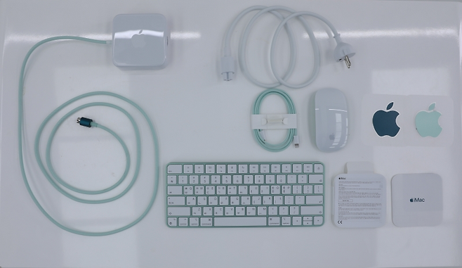 받은 제품은 옵션이 전혀 들어가지 않은 169만원짜리다. 제품 구성은 모니터와 본체가 합쳐진 일체형 PC와 전원 케이블, 어댑터, 키보드, 마우스, USB-C 케이블, 제품 설명서와 스티커가 따라온다. 구성품이 전반적으로 제품 색상에 맞게 만들어진 게 포인트다. 전원 단자는 특이하게 자석으로 본체와 달라붙게 만들어졌다. 덕분에 구멍에 맞게 꽂지 않더라도 손쉽게 전원을 연결할 수 있다.
