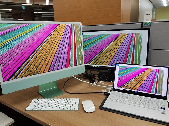 출력장치를 살펴보자. 디스플레이는 24인치 4.5K급 레티나 디스플레이로 1130만 화소에 500니트 수준으로 밝기를 낼 수 있다. 한 번에 표현할 수 있는 색도 10억 개에 달한다고 한다. 패널은 반사를 최소화한 유광 코팅으로, 반사가 아예 없는 건 아니지만 특별히 불편함을 느끼지 못했다. 또 주변 환경에 따라 디스플레이의 화이트밸런스를 보정해주는 트루톤(True Tone) 기능도 유용하다.