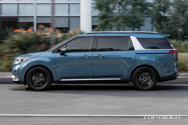그릴에는 바둑판 패턴이 삽입됐다. 새롭게 디자인된 19인치 휠은 검정색으로 마감됐다. 신형 카니발은 미국에서 7인승 또는 8인승으로 운영된다. 특히 신형 카니발 8인승 모델 상위 트림에는 2열 회전 시트가 탑재돼 3열과 마주 보는 형태로 주행할 수 있다.
