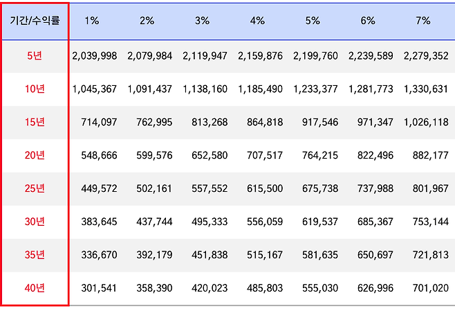 아래의 연금수령액 표는 1천만 원에 대한 수령 기간과 운용수익(이자)률에 따른 기준으로 환산한 금액입니다.