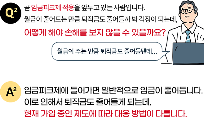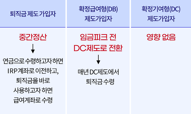 확정급여형(DB) 제도에 가입 중인 경우에는 임금피크제로 들어가기 직전 DB 퇴직금을 정산해서 확정기여형(DC) 제도로 이전해야 퇴직금이 줄어들지 않습니다. 만약, 회사에 DC제도가 없다면 DC제도 도입을 요청해야 합니다.