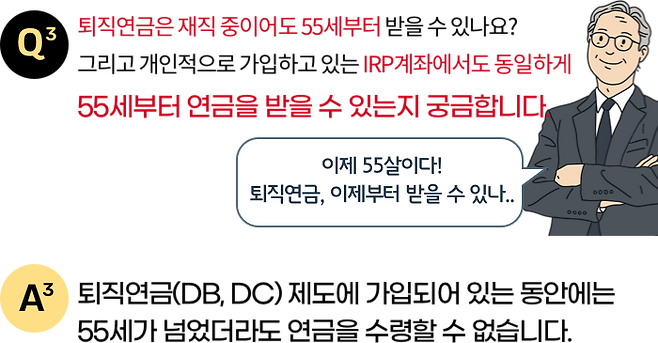 55세부터 반드시 연금을 수령해야 하는 것은 아니며, 55세 이후 본인이 원하는 시점부터 받을 수 있습니다.