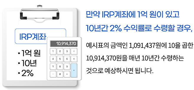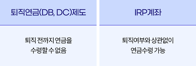 그러나 IRP계좌는 개인계좌이므로, 가입 기간이 5년 넘고, 55세가 되면 퇴직 여부와 상관없이 언제든지 연금수령을 선택하여 받을 수 있습니다.