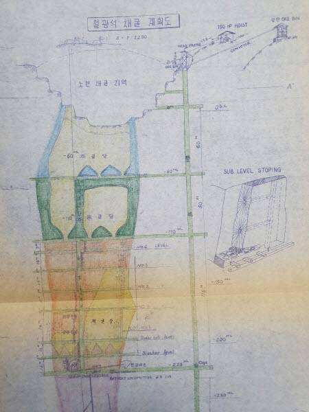 | ▲ 달천광산 최후의 광산인이었던 윤석원씨가 작성한 달천광산 지하 225m까지의 채광계획도. 지하광체를 채굴하는 기본 계획도다. 오른쪽 상부 지상에는 150마력 권양기와 광석 저장소가 있다. 오른쪽 그림은 중단채굴법(Sub Level Stoping)의 설명도이다. 노란색 채굴장은 ?110m까지 채굴한 곳이고 ?225m의 노란색 부분은 채굴했고 붉은 색은 아직 채굴하지 않은 철광석이다. <울산박물관 소장> |