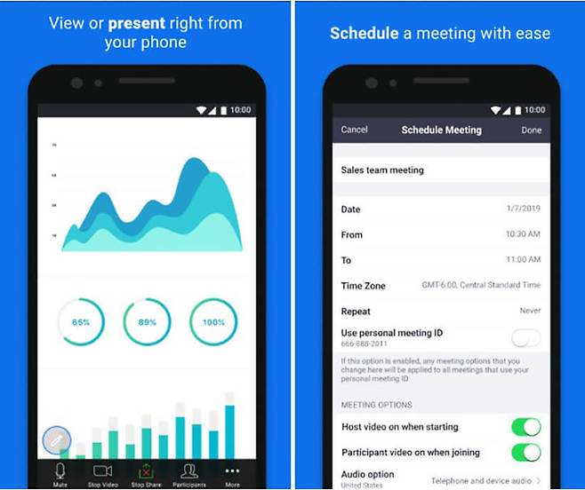 사실 이번 코로나19로 인해 많은 사람들이 협업 툴로 선택한 앱이 바로 ZOOM Cloud Meetings다. 사용법이 간단하고 무려 100명 미만의 사람들과 그룹통화가 가능하다는 점이 주효했을 것이다. 꼭 스마트폰이 아니더라도 PC로도 제한 없이 이용할 수 있어 업무용으로 딱이다. 실제로 통화에 참여할 사람들에게 전화번호가 아닌 이메일 주소로 URL 초대를 요청하는 방식이라 프라이버시 측면에서도 탁월하다. 국내 사용자들은 카카오톡 친구를 초대할 수도 있다.