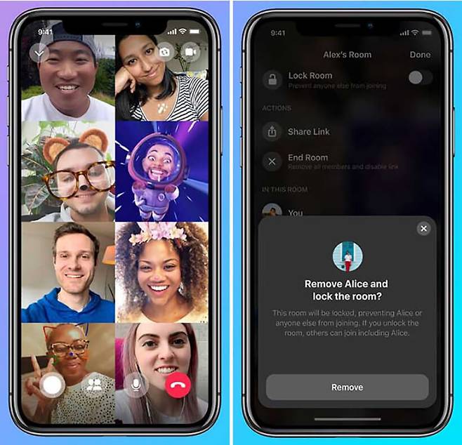 페이스북 메신저 룸은 최대 50명까지 그룹통화가 가능하며, 화면은 통화 참가 인원에 따라 분할된 타일 형태로 제공된다. PC로는 16명을 동시에 볼 수 있어 팀 회의 때도 용이하다. 물론 다양한 스티커 기능이나 페이스북 친구 기반으로, 업무용 화상회의 툴로는 아직 적합하지 않다. 대신 인스타그램, 왓츠앱 등의 앱과 연동이 가능하며, 시간 제한 없이 그룹통화가 가능하다는 것이 장점이다.