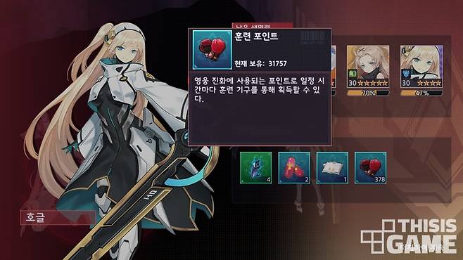 스테이지 클리어나 기지 건설 등을 통해 ‘훈련 포인트’를 받고, 이를 원하는 캐릭터에 투자하면 즉시 레벨이 상승하는 정말 직관적인 육성 구조를 가지고 있다. 이밖에도 장비, 장비 강화, 인연(호감도) 등의 여러 육성 요소들이 있지만 어렵거나 복잡하지 않다.