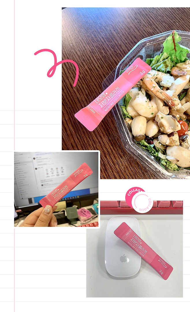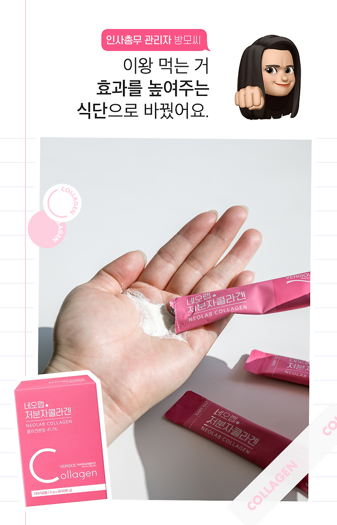 "포장도 핑크색으로 너무 예쁘기도 했지만 무엇보다도 알약을 잘 먹지 못하는 저에게는 안성맞춤이 제품이었어요. 비타민C 와 레몬분말이 들어있어 콜라겐 특유의 느끼함이 많이 느껴지지 않았고 상큼해서 먹기가 편했습니다. 타사 제품에 비해 1포당 콜라겐 함유량도 높고, 독일의 특허공법으로 만들어졌다고 하니 더욱 믿음이 가 출근해서 아침마다 열심히 먹었습니다. 환절기만 되면 피부가 많이 건조해서 입가주변에 버짐처럼 각질이 부각되었는데 콜라겐 덕분인지 이번 환절기는 무사히 넘기고 있어요. 다만 장점이자 단점이라면 콜라겐 분말 입자가 너무 고와서 입에 털어 넣었을때 가루가 코까지 올라와서 재채기를 하게 됩니다. 3개월분을 과감하게 구매한김에 식단까지 신경써서 얼굴부터 몸 전체를 건강하게 관리해 볼 계획이에요."