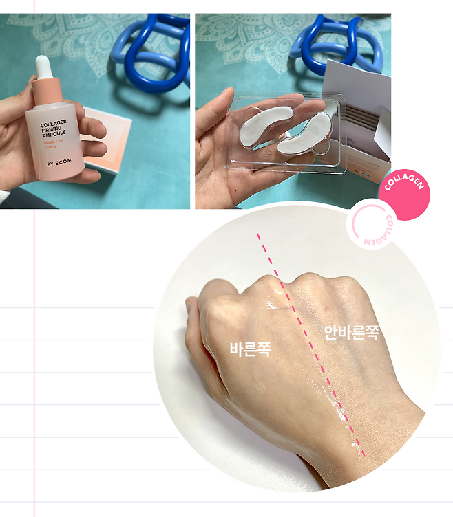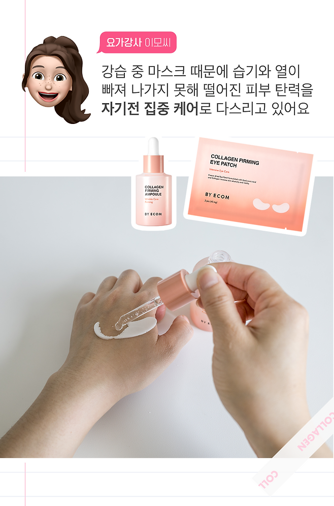 "저는 저녁에 요가 수업을 하고 집에 돌아왔을 때, 홈케어를 정말 중요하게 생각해요. 땀도 나고 마스크 속 피부가 열을 받아 온도가 많이 올라가는 게 느껴지거든요. 주름이나 탄력관리에 신경 더 써야겠다는 생각에 콜라겐 앰플과 패치를 함께 쓰게 됐어요. 바르자마자 수분이 꽉 차고 피부를 꽉 잡아주는 느낌이 들어서 좋았어요. 건성인 피부라 오일리한 제품 많이 사용해 봤는데 오히려 사용감은 콜라겐 퍼밍 앰플이 가볍지만 보습감은 더 높아서 훨씬 낫더라고요. 콜라겐 탄력 앰플이라고 해서 과하게 쫀쫀하면 어쩌나 걱정했는데 제 피부엔 딱 적당해요. 바를 때 느낌이 좋고 촉촉해서 눈가에만 쓰다가 패치와 함께 팔자주름 목주름 있는 곳도 사용하고 있어요. 오일을 사용하기부담스러운 봄여름에는, 콜라겐 퍼밍 앰플로 꾸준히 저녁에 케어할 생각이에요!"