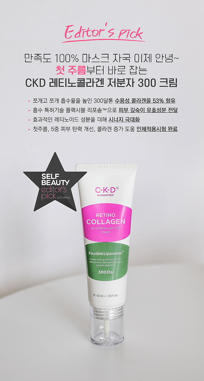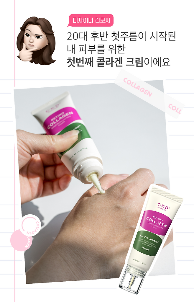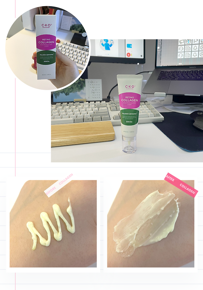 "제 피부는 복합성이고 건성 범위가 넓어요. 프리랜서 디자이너로 활동하면서 생활이 불규칙해져 빠르게 힘없고 칙칙해졌어요. 평소에는 보습 이외의 기능성 스킨케어 제품을 사용하지 않아서 콜라겐 저분자 300 크림을 바른 효과를 더 극적으로 느낀 것 같아요. 생애 첫 콜라겐 크림으로 대만족!