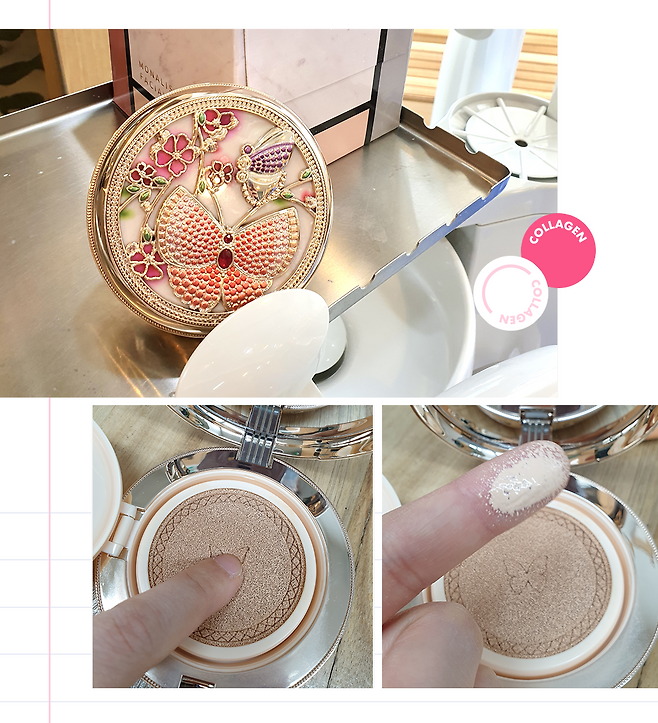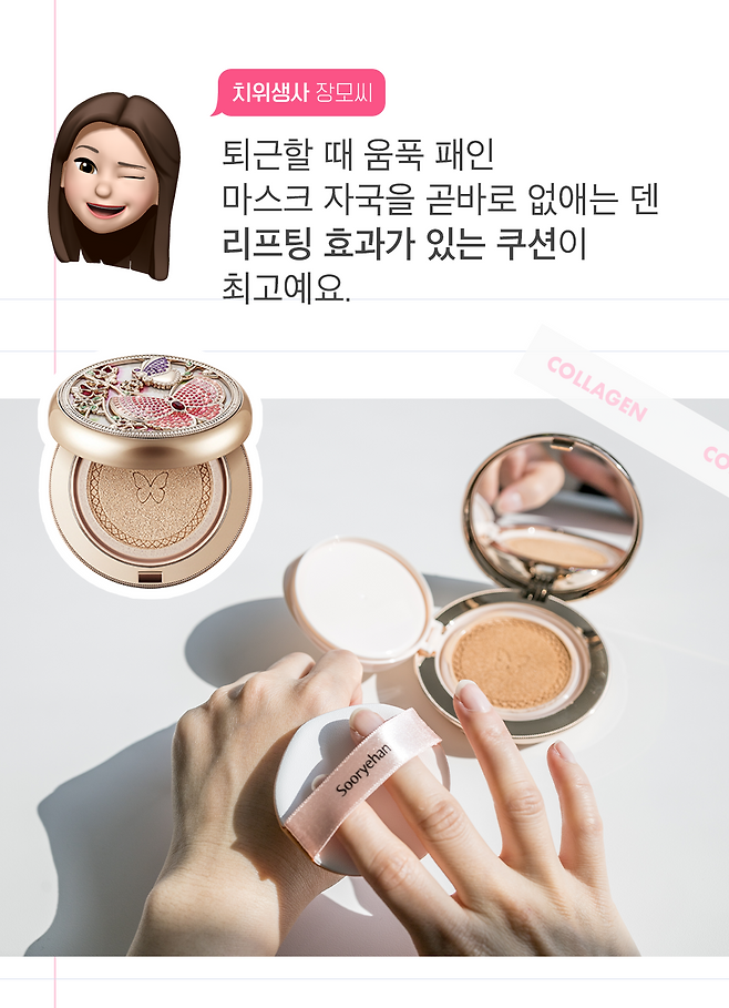 "코로나 전부터 마스크를 쓰면서 근무를 했기 해온 저만의 노하우라면 마스크 자국을 순식간에 가려 줄 수 있는 쿠션을 쓰는거예요. 수려한 골든 콜라겐 쿠션은 얼굴에 난 자국과 주름의 패인 부분을 채우면서 커버해줘서 민낯보다 얼굴이 더 탱탱해 보여서 좋아요. 촉촉하고 부드럽게 발리면서 그렇다고 부담스러운 물광스타일은 또 아니어서 마음에 들어요. 마스크 자국까지 쉽게 가릴 수 있을만큼 커버력이 좋은데 두껍게 커버되는 스타일은 아니예요. 병원이다 보니 수정 화장을 아예 못 하는데 다크닝도 없고 유지력도 괜찮은 편이에요. 다만 촉촉한 발림성 때문에 마스크에 묻어나서 픽서를 함께 사용하는 걸 추천해요. 섀이드도 누렇지않고 그렇다고 너무 밝지도않고 자연스러워요."
