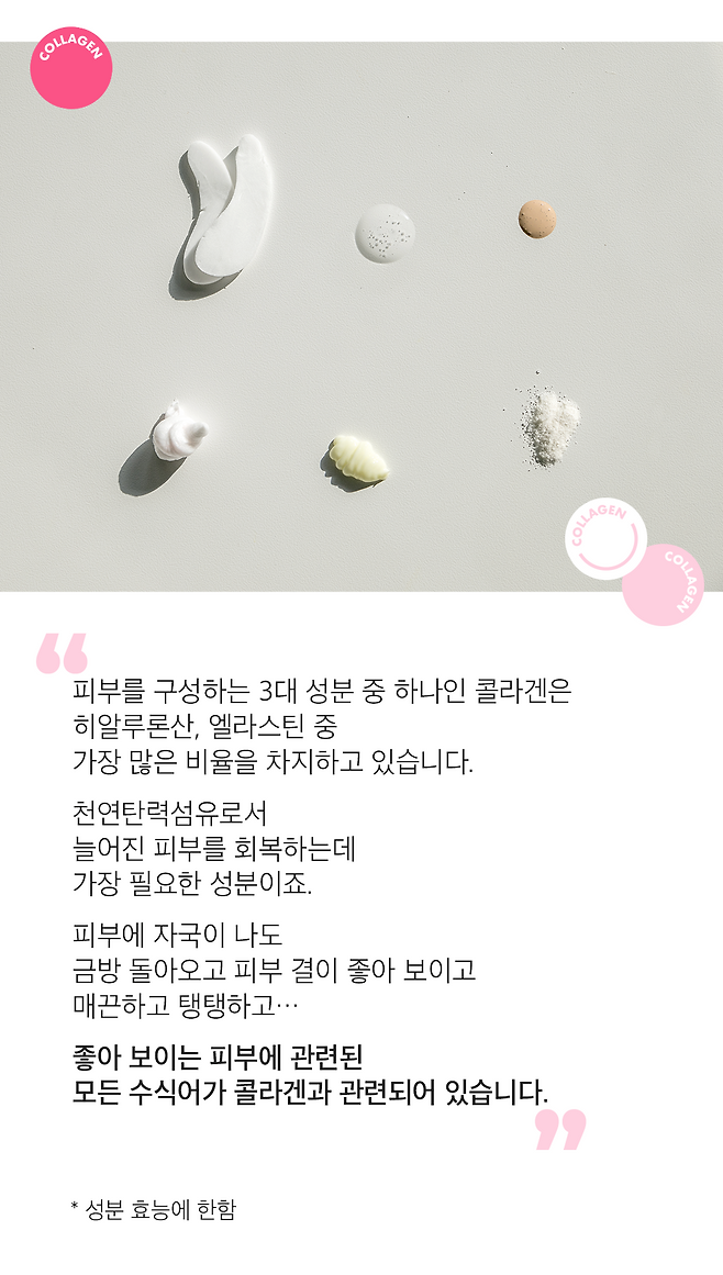- 피부 흡수가 빠른 콜라겐 성분 77.96%와 콜라겐 효능을 부스팅하는 펩타라겐 성분으로 피부 속부터 탄탄하게 집중 탄력 케어