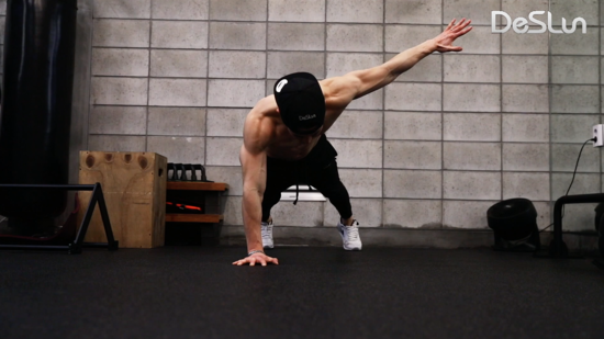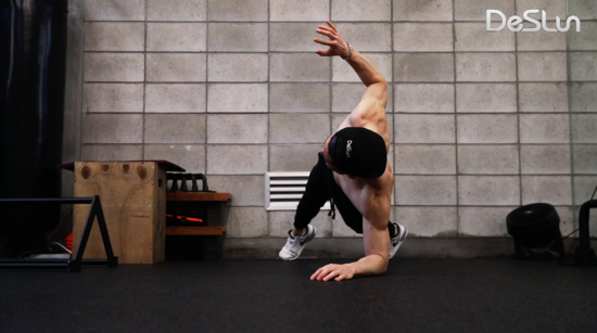 팔 한쪽을 위로 곧게 뻗었다 다시 플랭크 상태로 돌아 옵니다.