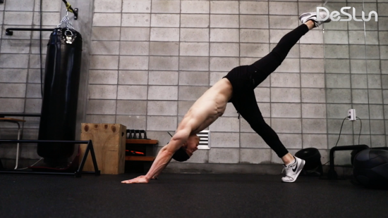 팔을 뻗은 플랭크 상태에서 한다리를 들고 곧게 뻗어 위로 높이 차 줍니다.