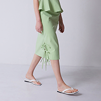 와이드 슬랙스지만 밑단을 묶을 수 있는 디테일이 있는 팬츠는 스타일링에 또 다른 재미를 선사합니다. 이 팬츠를 센스 있게 코디하려면 발목을 감는 스트랩 샌들과 함께 매치해보세요.