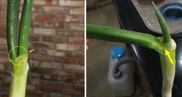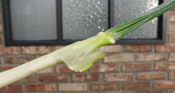 대파 뿌리처럼 대파 줄기와 잎 사이 이 부분도 흙모래가 껴 있는 경우가 많다. 잘라서 사용하지 않는 경우 이 부분도 깨끗이 씻어준다.