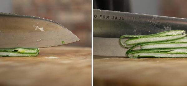 그리고 고기 먹을 때나 밑반찬으로 좋은 파채. 길고 얇게 써는 것이 중요한 파채는 보기엔 어려워 보이지만 요즘 화제인 꿀팁이 있다. 동그란 파를 한 부분만 세로로 잘라 넓게 펼친 후, 돌돌 말아준다. 말아준 대파는 사진 속 점선 방향으로 얇게 채를 썰어준다. 모두 썬 뒤 펼치면 얇고 긴 파채 완성!