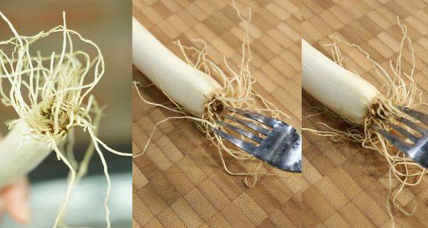 대파 뿌리에는 사이사이 흙모래가 많이 껴있는데, 이걸 제거하지 않으면 육수를 만들때 흙이 그대로 나올 우려가 있으므로 깨끗이 제거해주는 것이 중요하다. 여기서 꿀팁! 제거하기 힘든 뿌리 속 흙모래는 포크를 사용해 살살 빗겨주면 더욱 쉽게 씻어낼 수 있다.