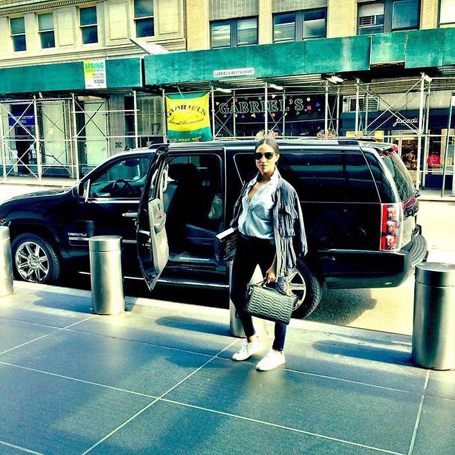 블랙 청바지에 '이로'의 가죽 재킷과 플랫, 선글라스를 매치했다.