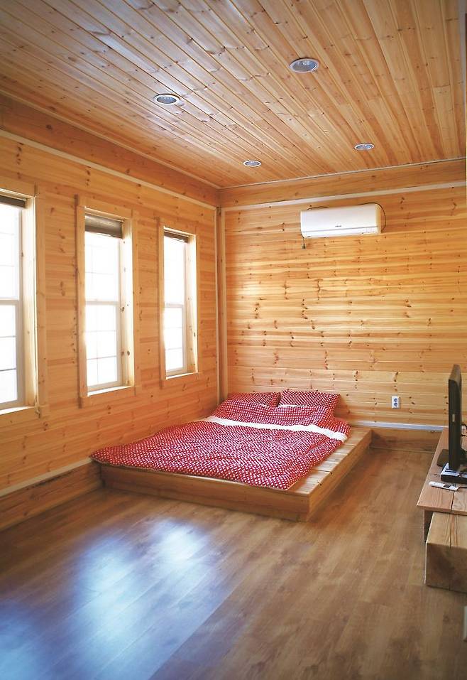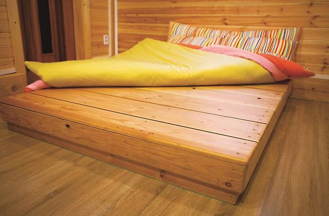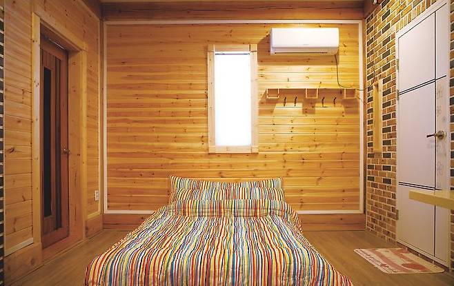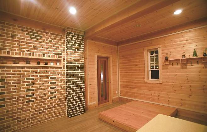 "우리에게 친숙한 나무, 돌 등을 사용해 자연스럽게 꾸몄어요. 루버로만 돌리면 단조롭기에 실과 실 사이에 파벽돌을 쌓고, 그 중간에 나무로 수납장을 만들고 그 주위에 강돌로 포인트를 주어 연출했어요. 침대도 더글러스 퍼로 평상처럼 짜서 하부에 고무 패킹을 달았는데, 바닥 난방을 하면 대류현상에 의해 따듯한 온기가 올라와 온돌침대 역할을 해요."
