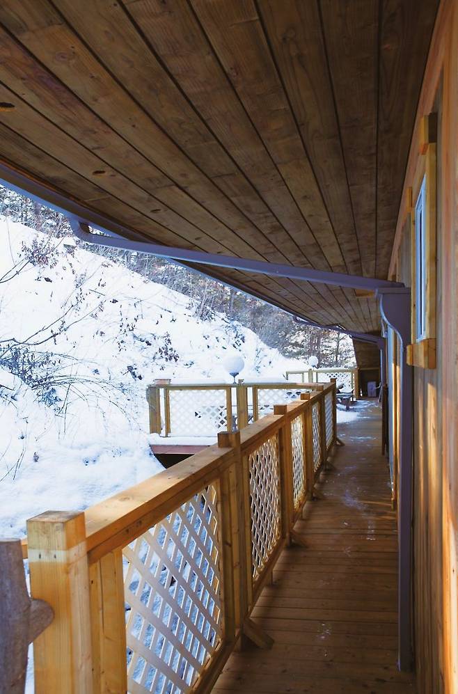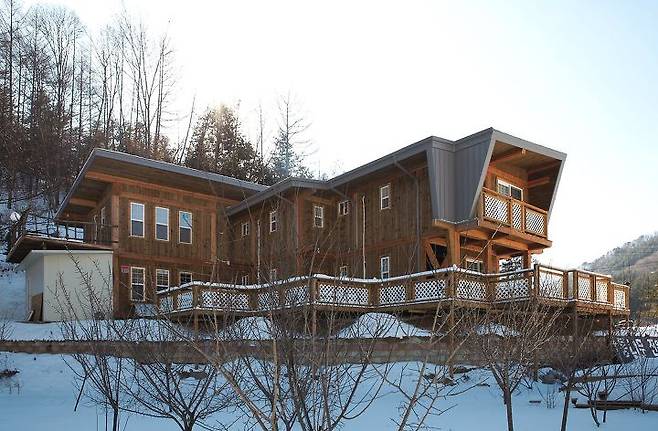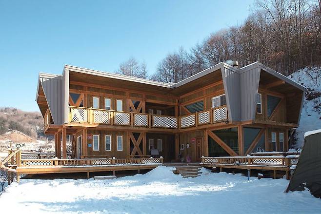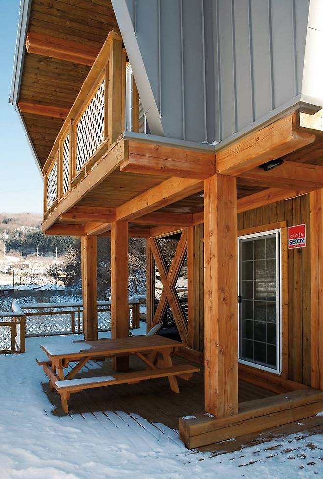 건축은 더글러스 퍼Douglas Fir(일명 미송美松)를 240×240㎜ 치수로 가공한 목재로 기둥과 보를 짠 후, 기둥과 기둥 사이에 투 바이 식스(2″×6″) 경량 목구조 공법을 접목하고, 글라스울 단열재, OSB, 투습·방수지, 시멘트 보드, 햄럭Hemlock 방부 사이딩 순으로 마감했다. 디자인이 모던함에도 최종 마감재인 햄럭 적삼목 사이딩으로 말미암아 마치 오래된 산장 같은 느낌을 준다.