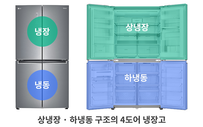 4도어 냉장고는 4개의 문과 3개의 냉장/냉동실이 있는 냉장고입니다. 위 칸은 냉장실, 아랫칸은 냉동실로 구성되어 있습니다.