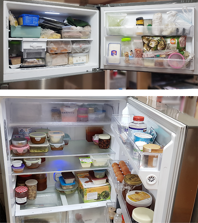냉동실/냉장실 모두 위쪽을 활용할 수 있어 자주 사용하는 식재료를 저장할 때 허리를 굽히지 않고 편리하게 사용할 수 있다는 점이 가장 큰 장점입니다.