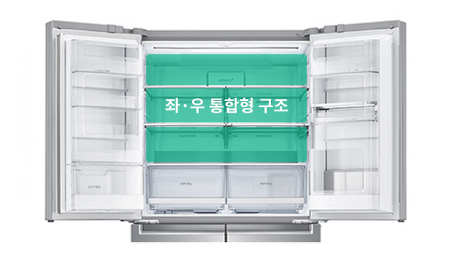 4도어 냉장고는 냉장칸의 좌/우가 통합되어 있어 넓이가 큰 식재료를 보관하기 좋고 쉽게 필요한 식재료를 찾아 꺼낼 수 있다는 큰 장점이 있습니다.
