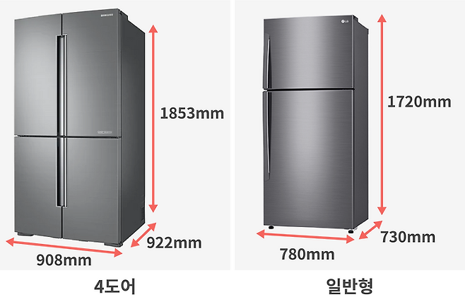 일반형 냉장고의 용량은 최대 600ℓ 정도로 4도어/양문형 (800~900ℓ) 대비 용량이 적어 식재료를 많이 저장하는 편이라면 용량이 부족하다고 느낄 수 있습니다.