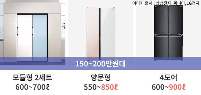 1도어 모듈형으로 냉장고(1대)와 냉동고(1대)를 구성할 경우 총 용량은 약 700ℓ, 가격은 160~200만원 수준으로 동일한 가격대로 구입할 수 있는 4도어/양문형 대비 약 15~25% 용량이 작아집니다.