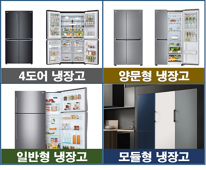 냉장고 타입은 크게 4도어, 양문형, 일반형, 모듈형이 있습니다. 각 타입에 따라 장/단점이 있기 때문에 나의 환경에 맞는 타입을 선택하는 것이 중요합니다.