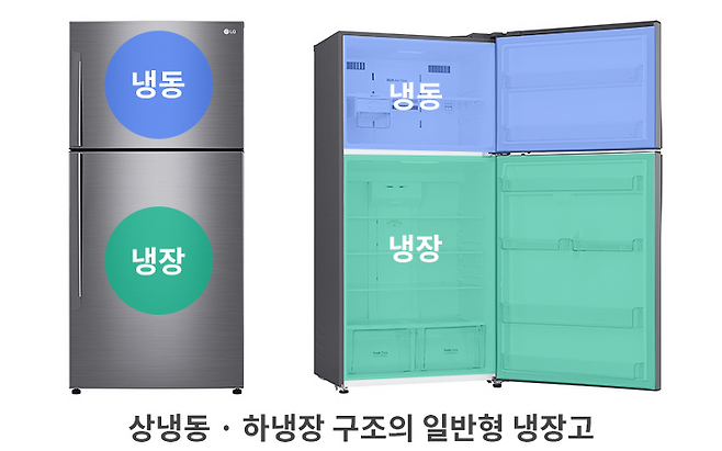 일반형 냉장고는 상부와 하부 2칸으로 나뉘어 있는 냉장고입니다. 일반적으로 위 칸은 냉동실, 아래 칸은 냉장실로 이뤄져 있습니다.