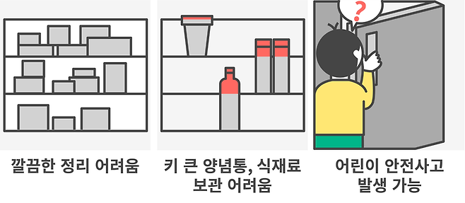 또한 냉장실 좌/우 분리가 안되어 양문형보다는 깔끔한 정리가 어렵고 키가 큰 양념통을 보관하기 불편할 수 있습니다. 간혹 낮은 냉동실 문에 어린아이가 매달리는 경우가 있는데, 문에 끼는 등 사고가 발생할 수 있으니 주의해야 합니다.