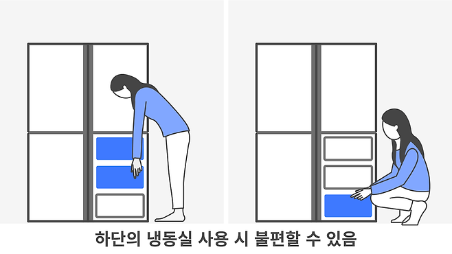 단점으로는 냉동실이 아래쪽에 있어서 냉동실을 사용할 때 무조건 허리를 굽히거나 앉아야 한다는 점입니다.