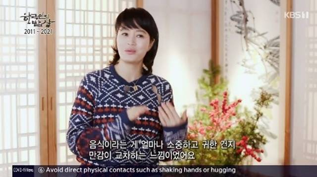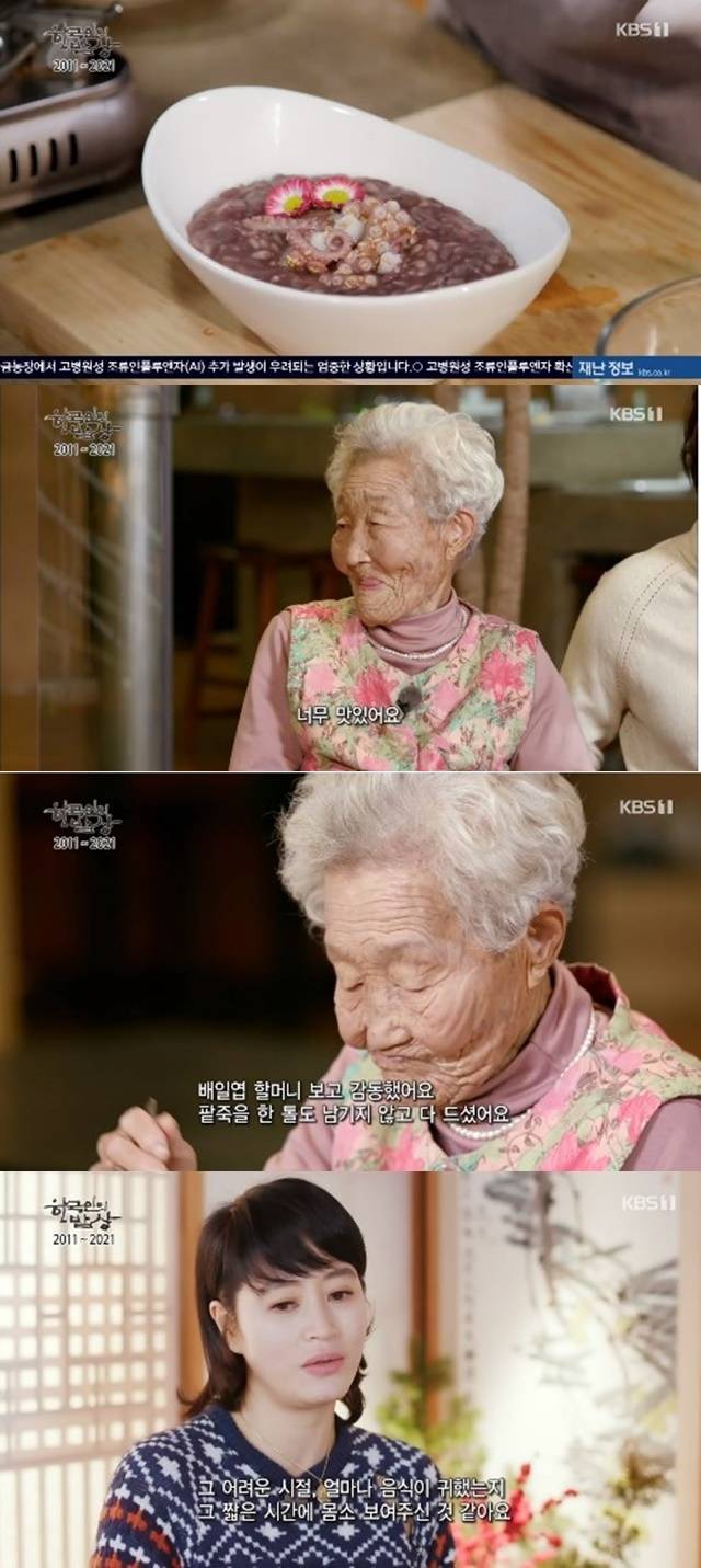 김혜수는 제작진과의 인터뷰에서 “배일엽 할머니를 보고 감동했다. 낙지 팥죽을 한 톨도 남기지 않고 다 드셨다. 그 어려운 시절, 얼마나 음식이 귀했는지 그 짧은 시간에 몸소 보여주신 것 같다"고 밝혔다. 이어 "음식이라는 게 얼마나 소중하고 귀한 건지 만감이 교차하는 느낌이었다. 남김없이 비우는 것을 보고 음식을 귀하게 여기는 어르신에게 감동을 받았다”고 밝혔다. (사진= KBS 1TV '한국인의 밥상' 캡처)